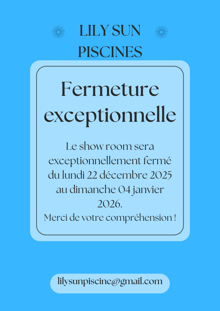 La société et le magasin seront fermés pour les fêtes de fin d'année du lundi 22 décembre 2025 au dimanche 04 janvier 2026 inclus.